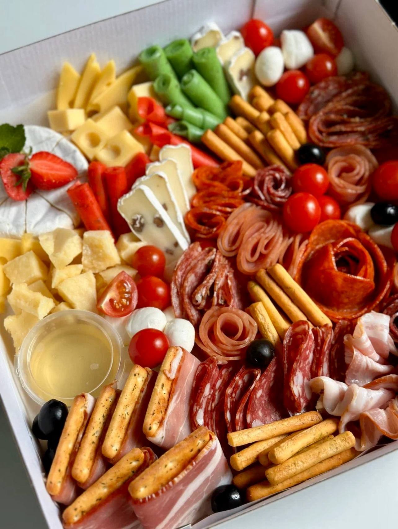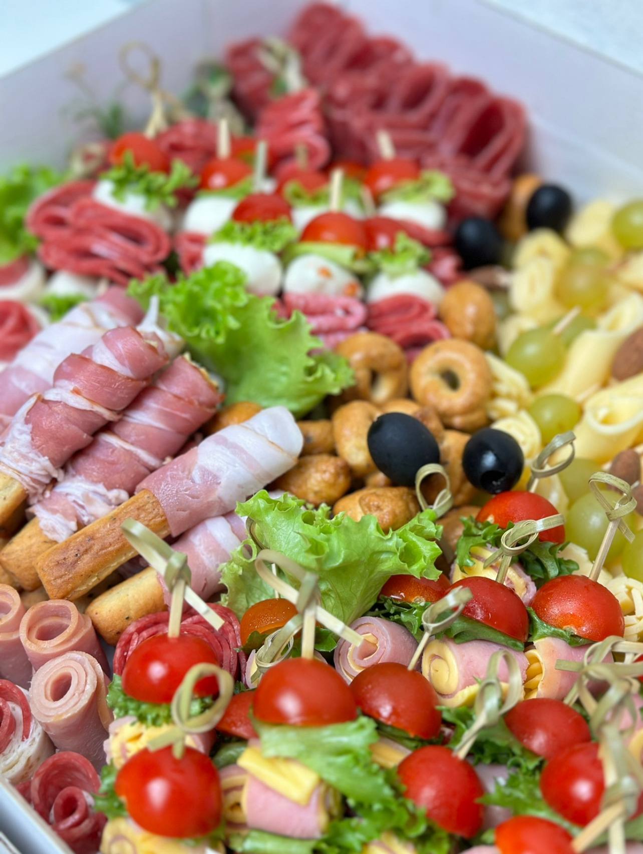 Гриссини с грудинкой -16 шт. Рулетики с салями в лаваше - 16 шт. Канапе с моцареллой, черри и итальянской колбасой - 12 шт. Канапе-рулетики из индейки, сыра и черри - 12 шт. Индейка Саброссо в нарезке Сырное ассорти - Пармезан, Маасдам Канапе сырные с виноградом Тарралини