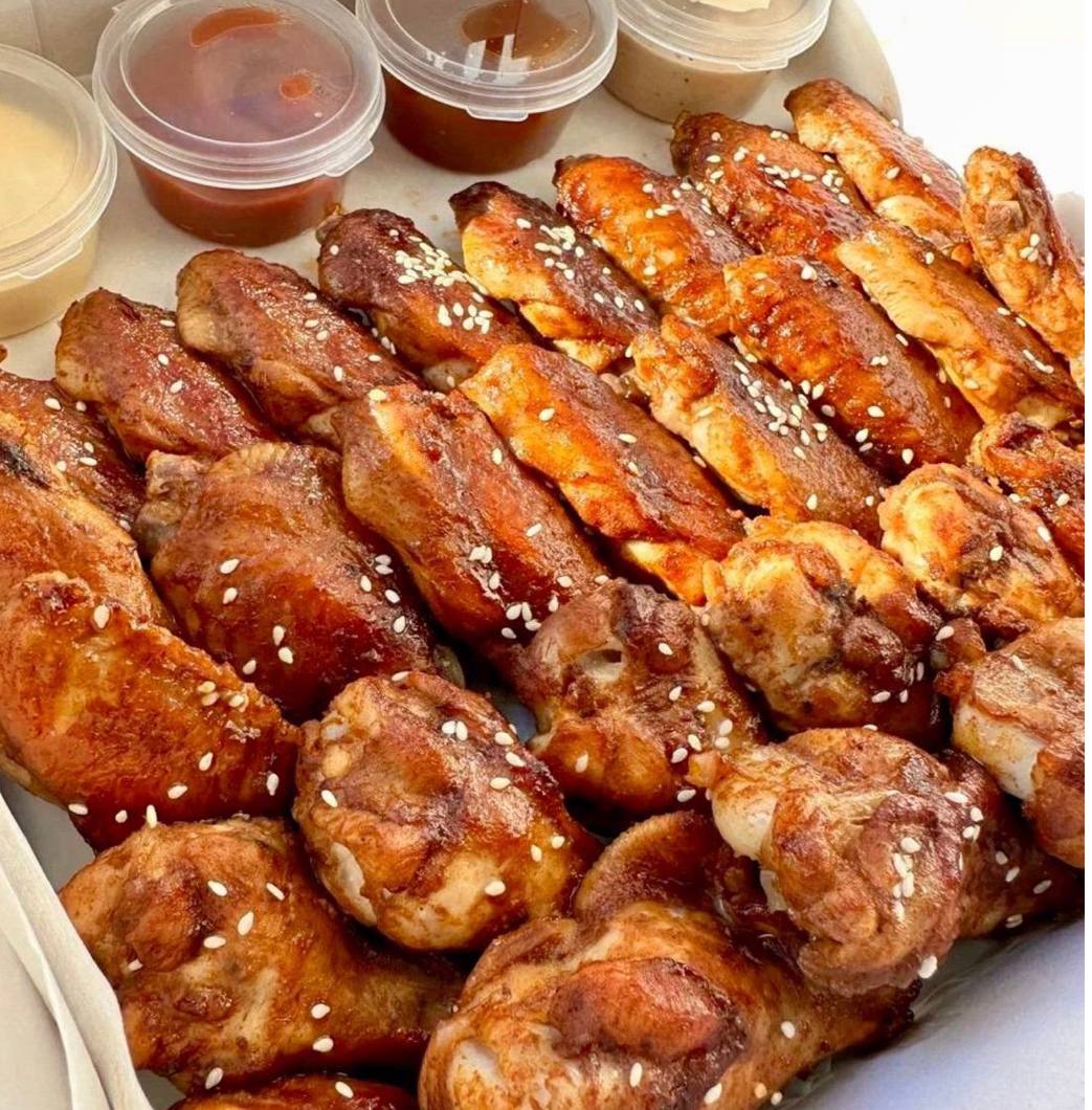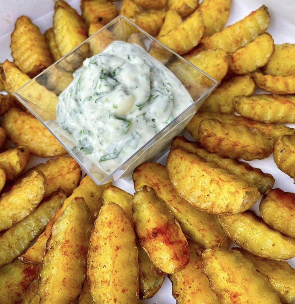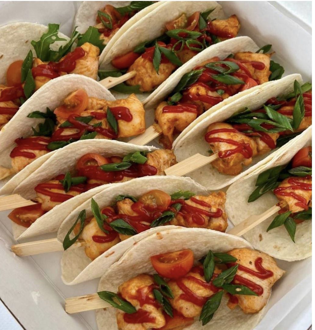 Куриный шашлычок на шпажке в лаваше, томатным соусом и зеленью.