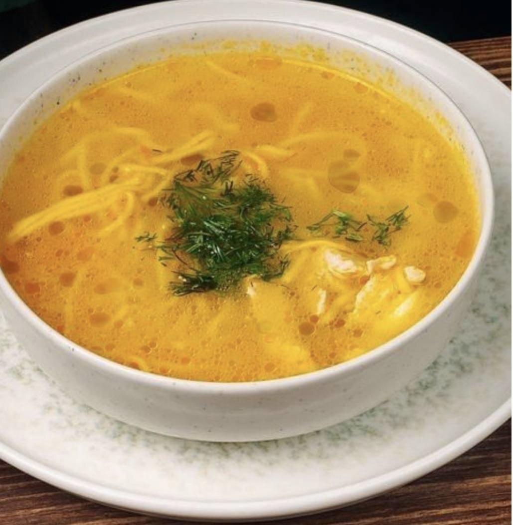 Наваристый куриный бульон с лапшой домашнего приготовления и курицей.
