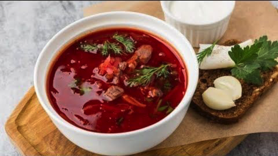 Традиционный борщ на говяжьем бульоне с бородинским хлебом, салом и сметаной.