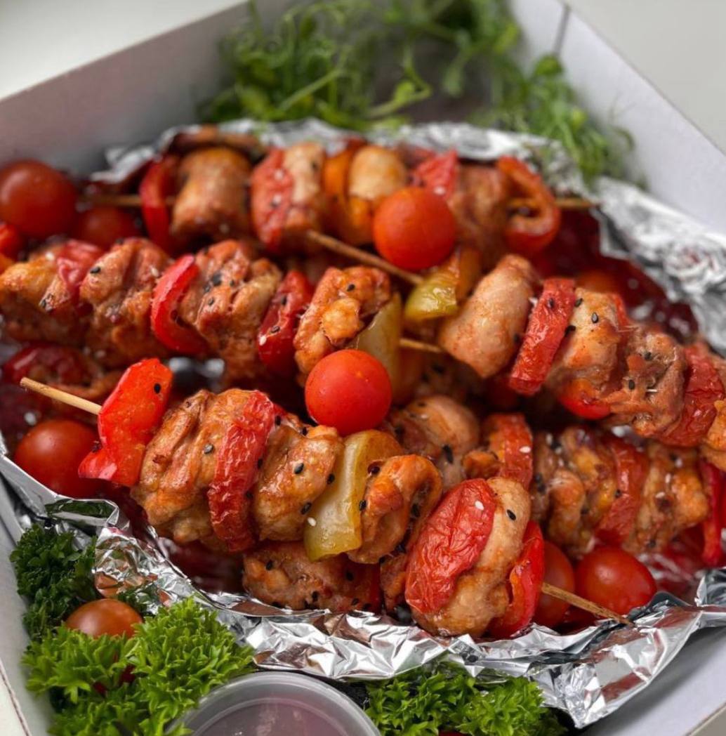 Шашлычок из филе куриного бедра с перцем в авторском маринаде на шпажке.