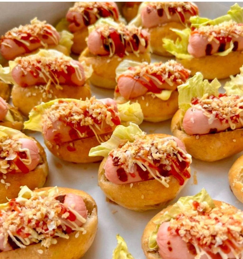 Булочки собственного производства, с соусом, маринованным огурчиком, помидоркой, листьями салата, луком и куриной котлеткой.