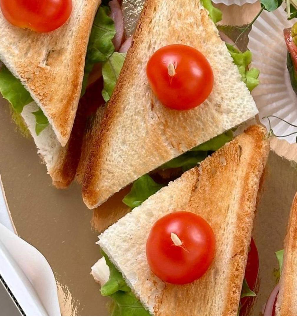 Тост - гриль с ветчиной из индейки, сыром, огурцом, помидоркой и листьями салата.